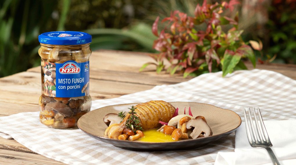 Quando le patate saranno pronte, portare in tavola tiepide o calde, insieme al misto funghi con porcini di Neri Sottoli e la crema allo zafferano e limone.
